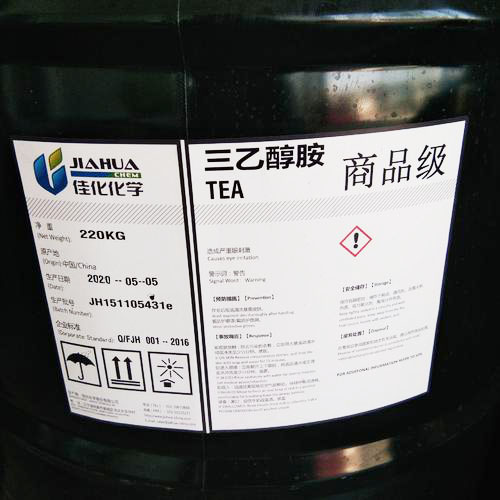 【物化性質】熔點21.2℃,沸點360.0℃,227℃(20kPa),相對密度(20/4℃)1.1242,動力粘度(25℃)613.3mPa?s,折射率(nD20)1.4852,閃點193℃。三乙醇胺能與水、甲醇和丙酮混溶。在25℃時的溶解度為:苯4.2%,乙醚1.6%,四氯化碳0.4%,正庚烷小于0.1%。微有氨的氣味,極易吸潮,三乙醇胺能吸收空氣中二氧化碳,露置空氣中以及在光線下變成棕色